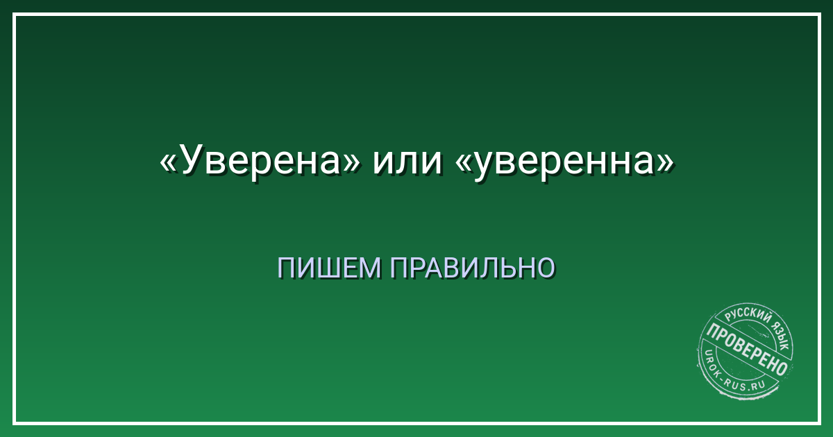 «Уверена» — это краткое прилагательное или краткое причастие? Внимание: слово «уверенный» — это отглагольное прилагательное (от глагола «уверить»). В полной форме пишем две «н»: «уверенный взгляд». Но в краткой форме — всегда одна «н», если это прилагательное среднего или женского рода единственного числа. Сравните: «уверен» (мужской род, одна «н»), «уверена» (женский, одна «н»), «уверено» (средний, одна «н»), «уверены» (множественное число, одна «н»).