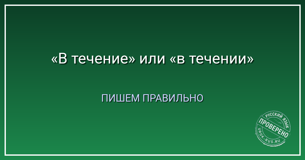 А если вы пишете «в течении» раздельно с И на конце, то это существительное «течение» в предложном падеже. Означает место — «в потоке», «внутри течения». Примеры: «В течении реки были водовороты», «В течении болезни наступил перелом». Авторская ремарка: я запомнил так: если можно вставить слово — «в быстром течении», «в северном течении» — то пишем с И. Если нельзя — с Е.